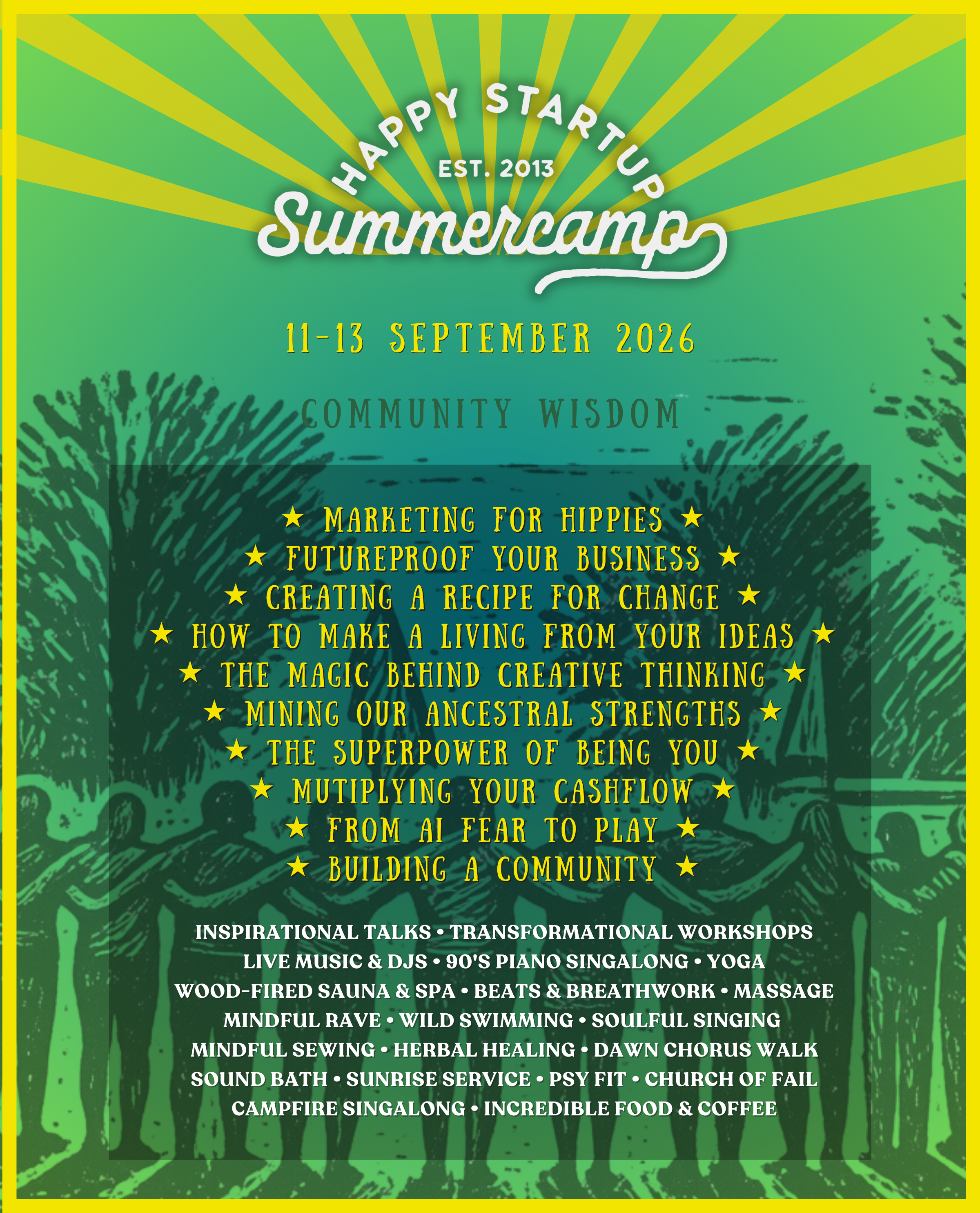Started by The Happy Startup School in 2013, Summercamp is where 150 purpose-driven founders, solopreneurs and leaders from around the world come together to get inspired, learn from one another and have fun over 3 life affirming days.
